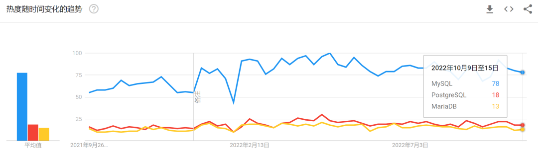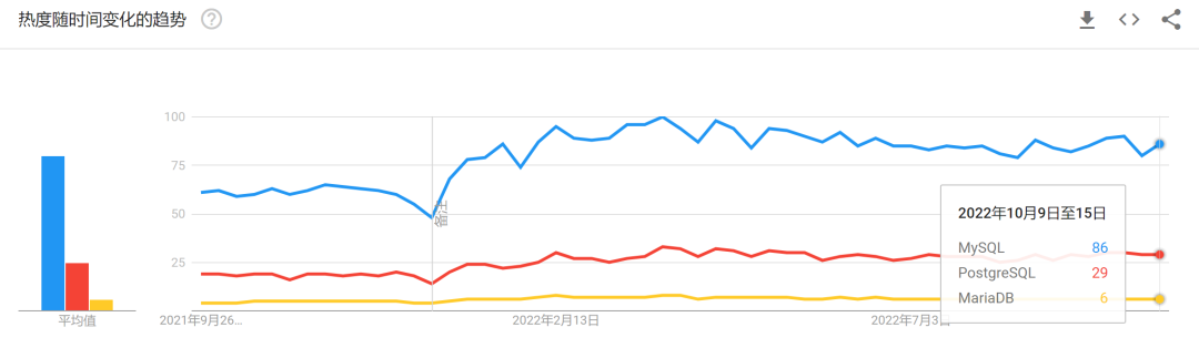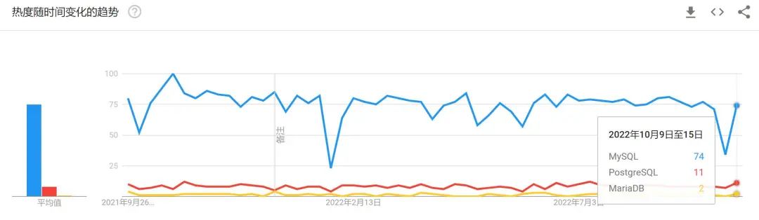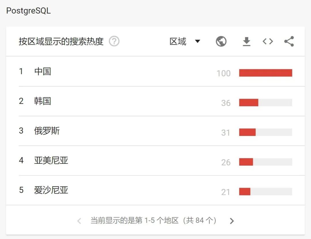 这个结论是如何得到的?具体哪个国家 PostgreSQL 又用的最多呢?因为纵观国外大厂,即便 Google、Facebook、Amazon、Tesla、Github 等公司,他们业务中 MySQL 数据库的使用量也远远多于 PostgreSQL。如果只是看几个媒体的报道,可能会看到 Uber 公司用了 PostgreSQL 数据库。但可能过段时间又会看到 Uber 换回了 MySQL 数据库。又或者XX公司用了PostgreSQL,可能只是在一个监控系统,报表系统,日志系统中应用。但出来分享的人可能就拿着XX公司的名义,鼓吹 PostgreSQL 的大规模应用实战。所以,作为个人来说,是很难看清里面的门道。但是通过 Google Trend 这样的网站,很容易从大盘上看到 MySQL 和 PostgreSQL 的热度情况。更关键的是 Google Trend 可以看到各国家中每种数据库的流行趋势。先来看 MySQL 和 PostgreSQL 的全球大盘情况∶由于当前 MySQL 分支版本比较多,类似 MariaDB、Percona、各家云厂商的 MySQL 分支版本分流了对于 MySQL 的热度统计。但即便如此,从全球看 MySQL 的热度是 PostgreSQL 数据库的3倍(86∶29)!那么,哪个国家用 PostgreSQL 最多呢?不是说国外用得最多么?很可惜,并不是!PostgreSQL 最为流行的国家是中国而不是国外。具体看的话,PostgreSQL 最为流行的前五个国家分别是中国、韩国、俄罗斯、亚美尼亚、爱沙尼亚。国外用的多,是不是美国 PostgreSQL 用的多呢?可以看到,美国 PostgreSQL 的热度远不及中国,只排在67位。热度仅中国的1/20。既然,中国是 PostgreSQL 的大本营,那么在中国 MySQL 和 PostgreSQL 的热度情况又是如何呢?可以看到,在中国,MySQL 数据库的热度是 PostgreSQL 的6~7倍(74∶11)。对比全球的3倍,差距显然是更大了!!!另一方面,MySQL 创始人 Monty 分支的版本 MariaDB,已经有13年的发展时间。从当前热度来看依然离 MySQL 比较远。但在韩国市场,MariaDB 的热度非常不错,甚至仅凭自己就能和 PostgreSQL 扳扳手腕。