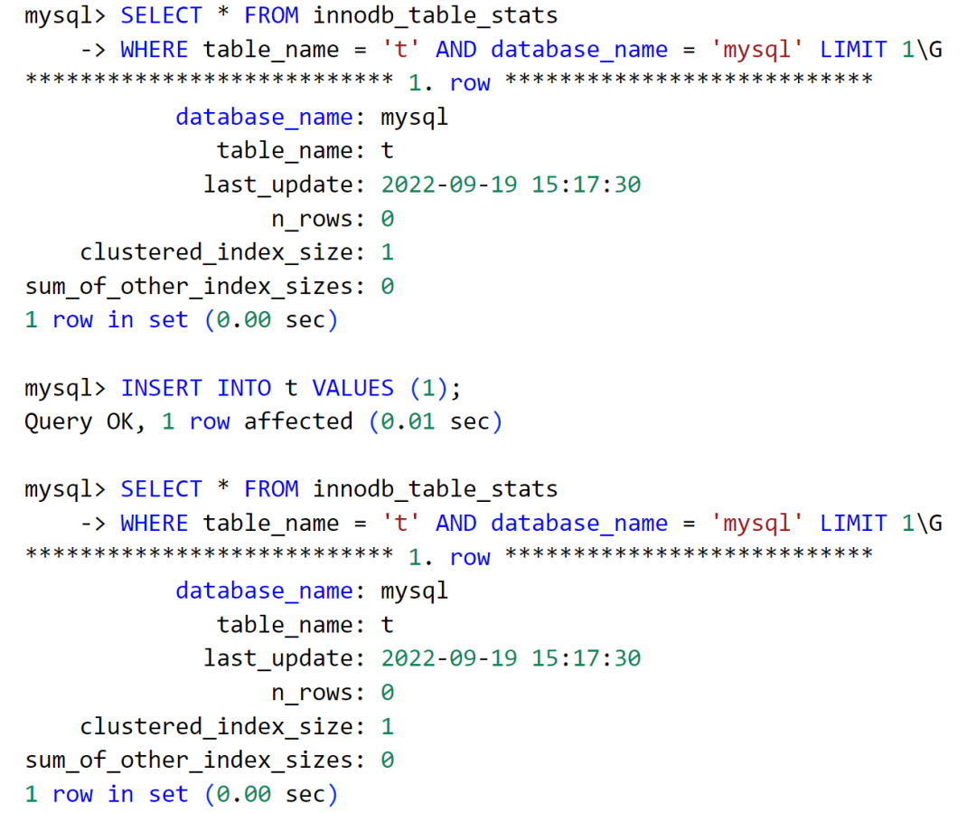 待下次读取表的元数据字典信息时, 会重新分配和初始化表的元数据字典对象,而这时 update_time 就会显示为 NULL,从而导致统计出错。