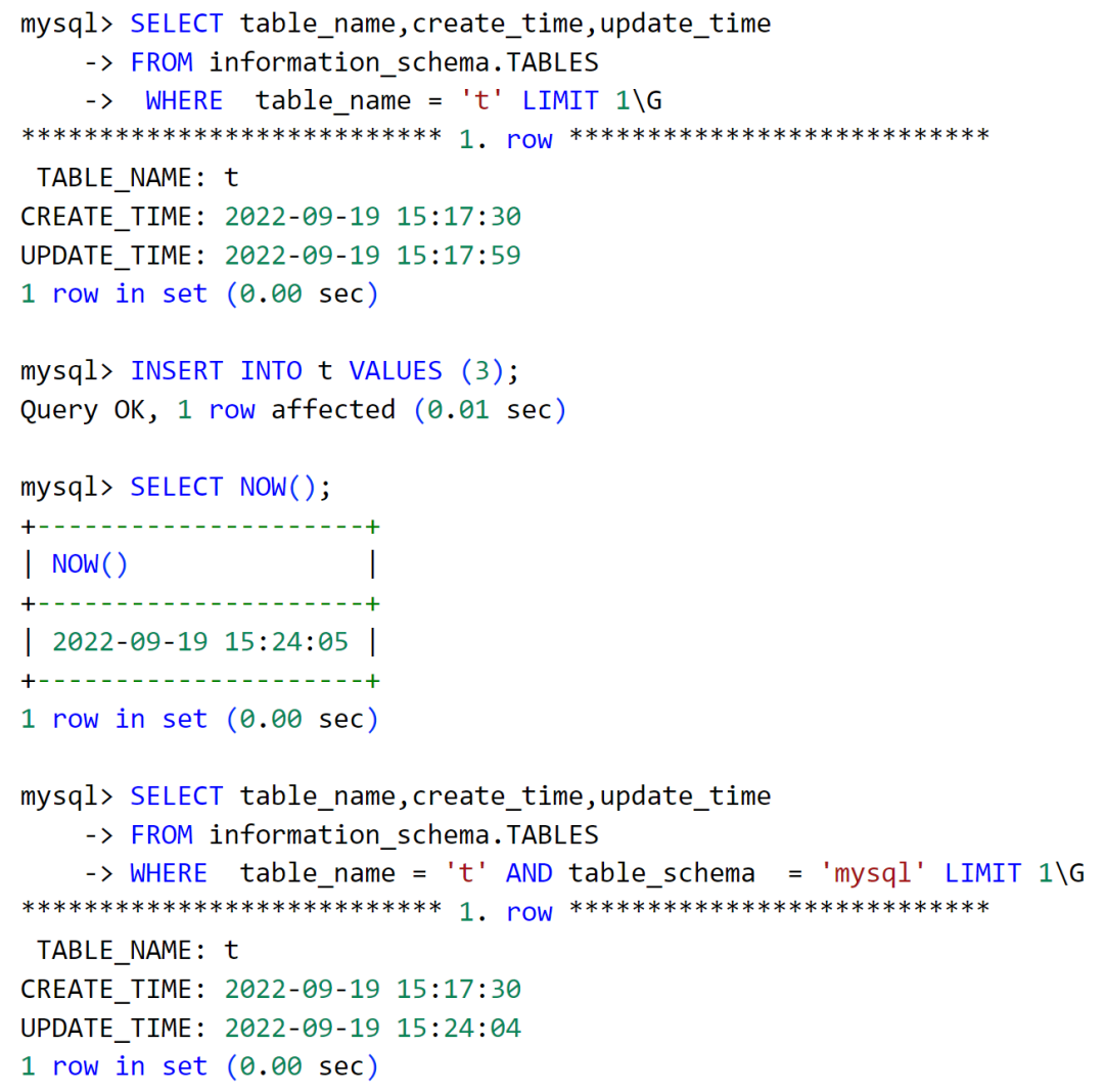 可以看到插入记录后,表 t 的最后修改时间从15:17:59 变为了 17:24:04,是最新变更的时间。