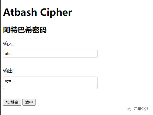 下面是使用JavaScript编写的阿特巴希密码加密程序,并附带HTML页面展示代码: