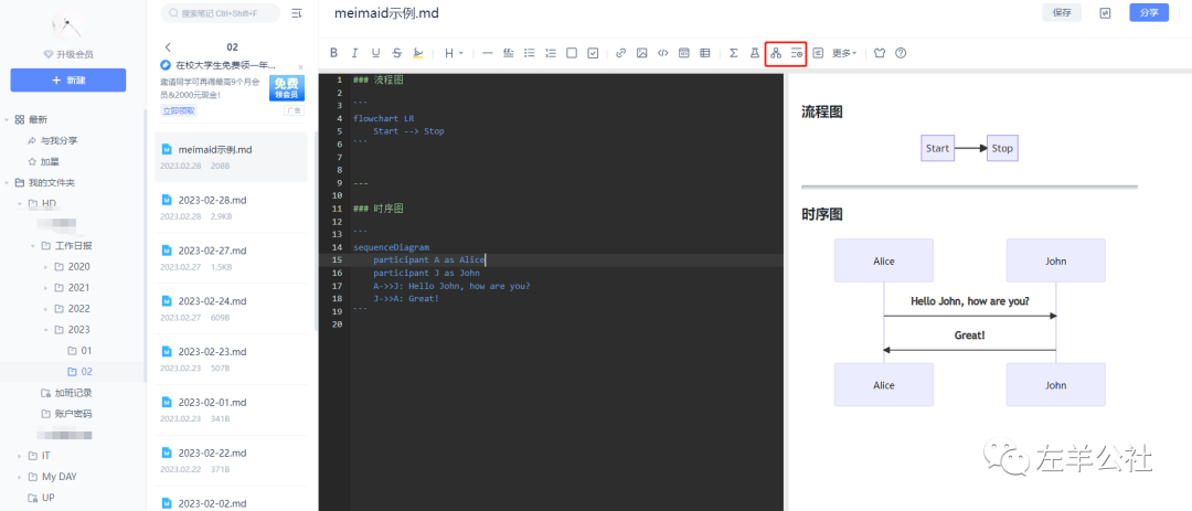 就在昨天,左羊在使用有道云笔记做每日工作计划时,发现一个Markdown工具meimaid,meimaid能够根据Markdown写法生产流程图、时序图、饼图等各行业常用图像。