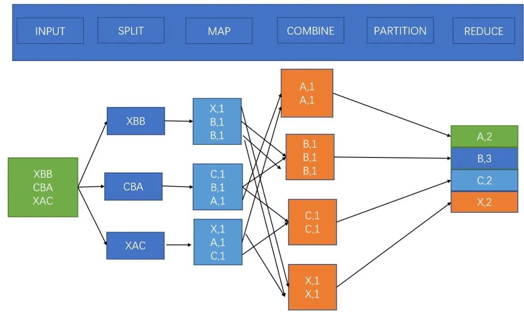 input输入,split分割,map映射转换,combine组合,reduce是一个动词,减少数量、价格等。这让我很迷惑,从示意图来看reduce执行的是最后的合并过程,我们姑且将其理解为聚合吧。在上面的图例中,combine想key相同的进行聚合,最后分成四组,而reduce阶段则是对每个小块本身进行聚合。基本同Stream的reduce函数是类似的。