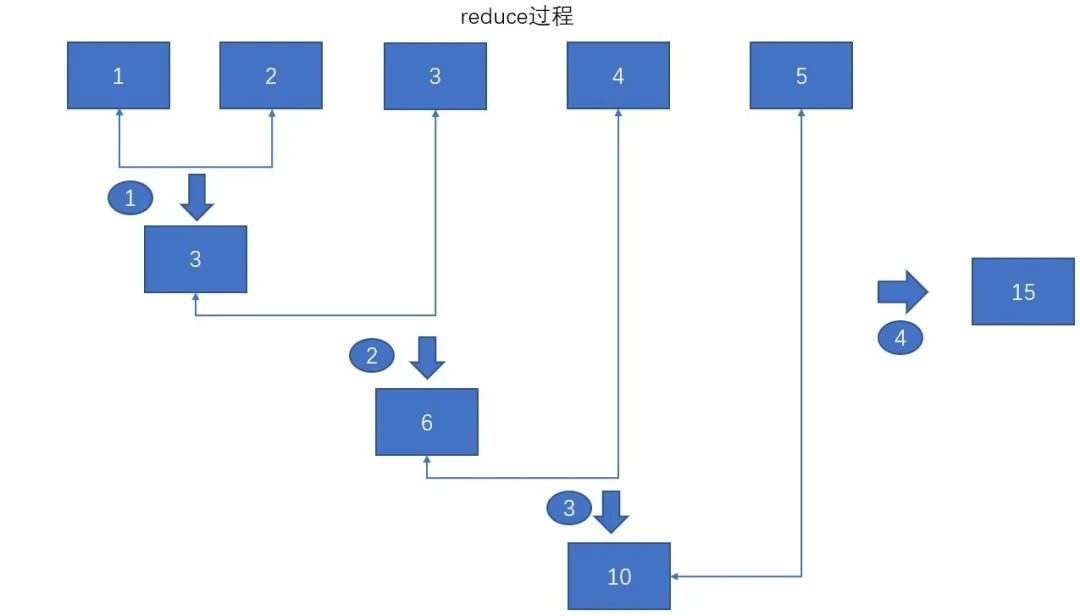 第一个函数等价于上面的代码,上面的代码首先从集合中找到第一个元素,然后和集合中的其他元素做apply运算,得到结果之后,这个结果再和其他元素做运算,直到所有元素参与运算完毕。这样说可能有点抽象,一个简单的例子是累加求和,如下图所示