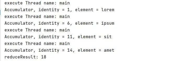 System.out.println("Accumulator, identity = " + identity + ", element = " + element);