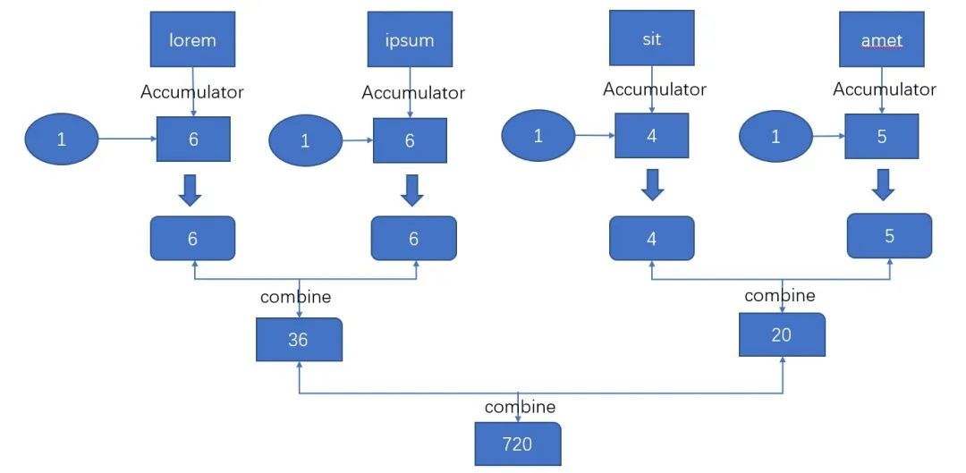 combiner.apply(6, accumulator.apply(1, 5)) = 36 accumulator.apply(6, 5) = 30