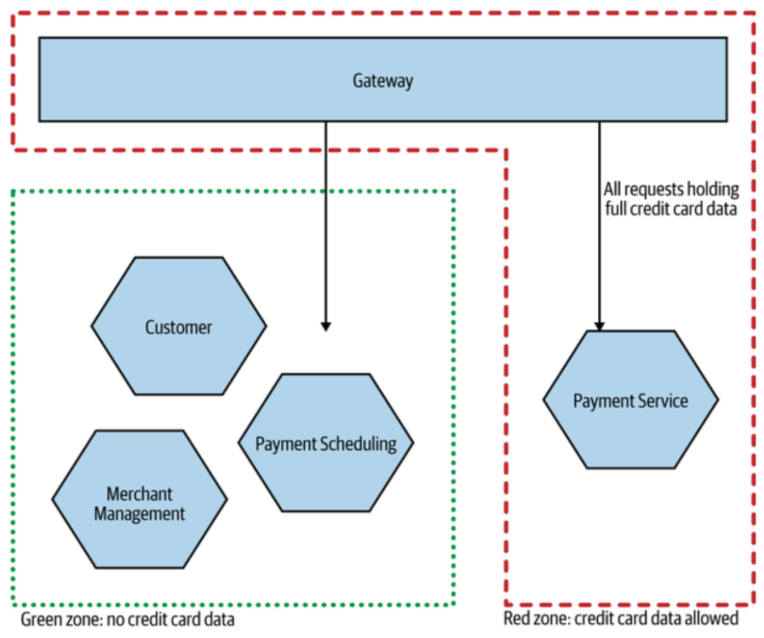 同样以支付系统来考虑,比如我们需要处理用户的信用卡信息,而这些信息是很敏感的,按照相关的要求,对处理信用卡信息的服务需要进行额外的监管,这时一种比较好的做法就是把凡是能看到信用卡信息的流程都放到一起(下图中的红色虚线内),把别的不涉及到信用卡信息的服务放到绿色虚线框内,这样的划分就是考虑到了数据的因素,如下图所示: