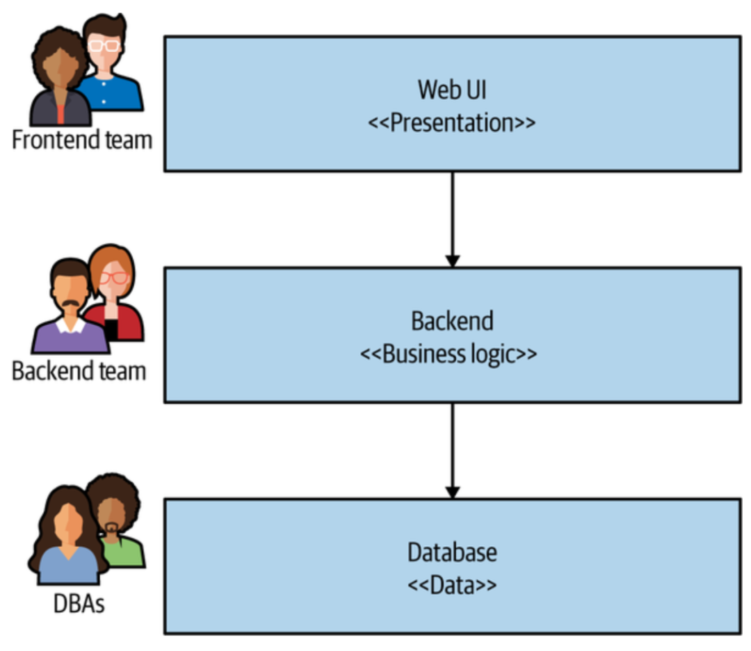 在早期的三层架构中(如下图所示),就是前后端,数据库的架构中,我们会根据这个来进行划分。同样的在微服务中,不同的技术栈也是我们划分不同微服务的一个需要考虑的因素,比如说你想把系统中的一部分用Rust来写,以提高开发的性能,那么很显然就需要考虑是否把这部分独立出来成为一个服务。