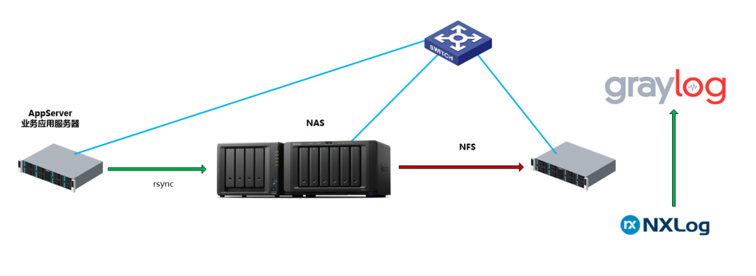 利用rsync将AppServer业务服务器上应用日志同步到群晖NAS上,然后NAS利用NFS或者其他协议挂载到GrayLog服务器上,在GrayLog服务器上面安装nxlog读取NFS挂载目录下的日志文件,即可实现日志采集读取