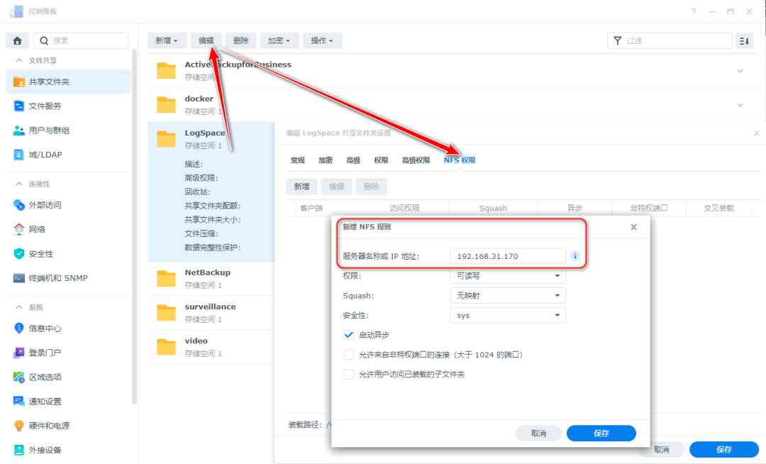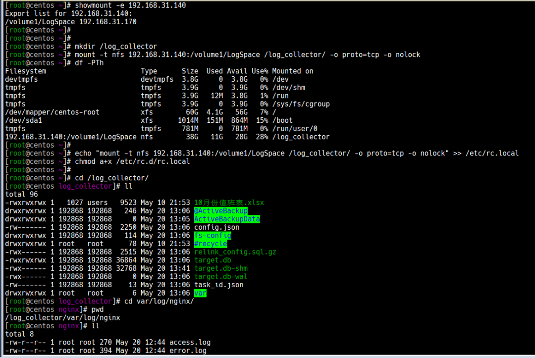 mount -t nfs 192.168.31.140:/volume1/LogSpace /log_collector/ -o proto=tcp -o nolock