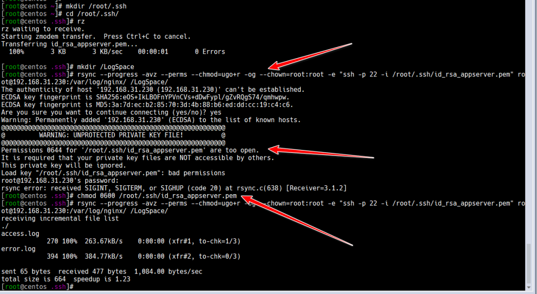 rsync --progress -avz --perms --chmod=ugo+r -og --chown=root:root -e "ssh -p 22 -i /root/.ssh/id_rsa_appserver.pem" root@192.168.31.230:/var/log/nginx/ /LogSpace/