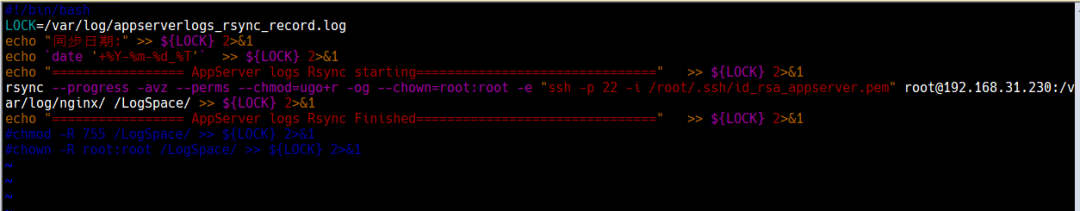 rsync --progress -avz --perms --chmod=ugo+r -og --chown=root:root -e "ssh -p 22 -i /root/.ssh/id_rsa_appserver.pem" root@192.168.31.230:/var/log/nginx/ /LogSpace/ >> ${LOCK} 2>&1