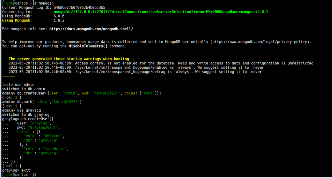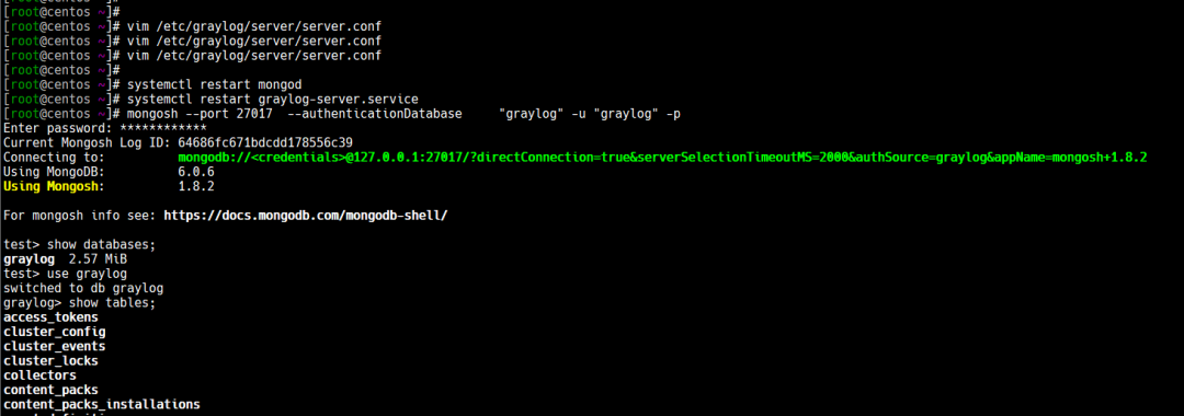 mongosh --port 27017 --authenticationDatabase "graylog" -u "graylog" -p