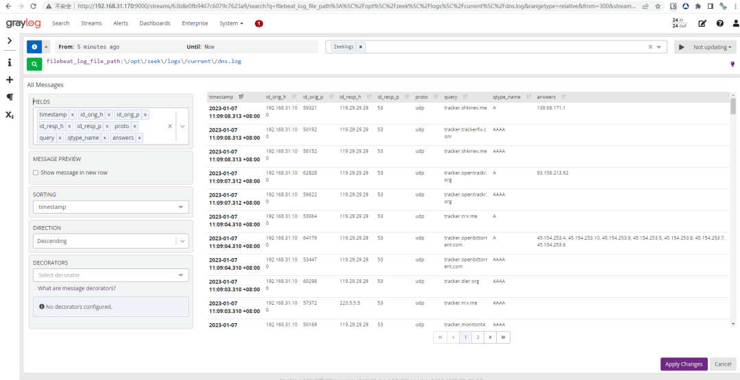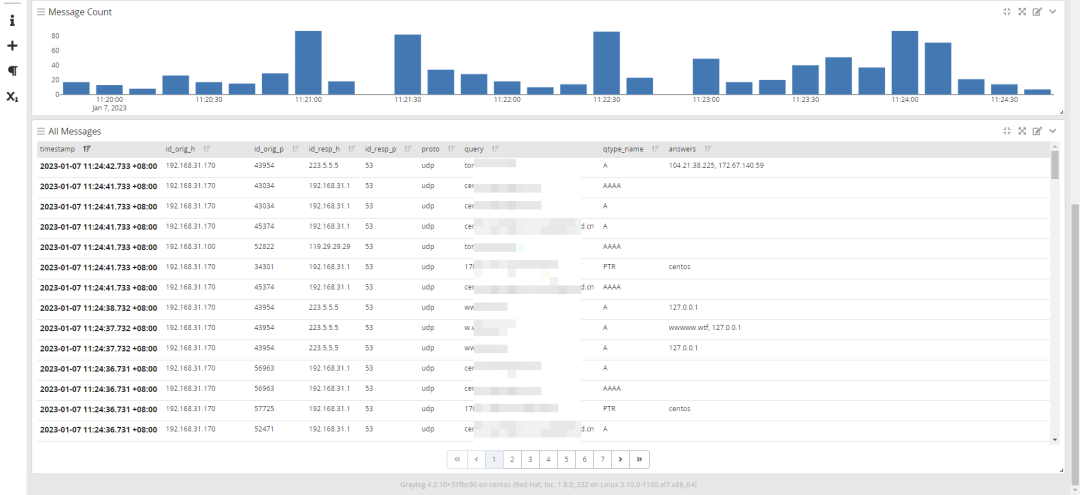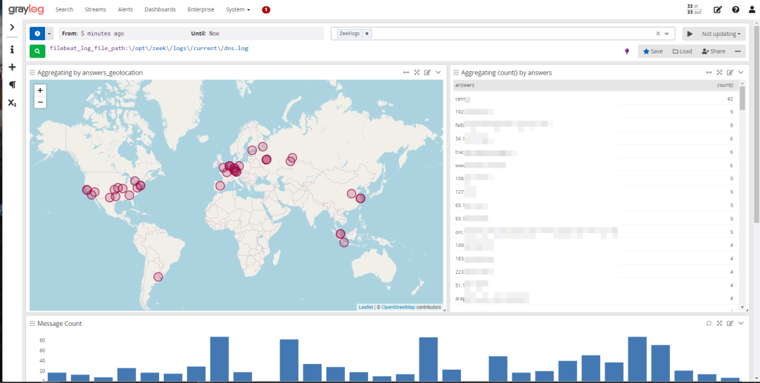 1、zeek的部署(能否rpm包的方式部署,编译部署太耗费时间) 2、流量镜像问题:zeek服务器的网卡如何配置混杂模式,交换机流量镜像如何配置 3、zeek的流量分析日志读取问题:zeek的日志转成json格式日志,使用graylog-sidecar+filebeat方式读取,并json提取器获取字段信息 4、GrayLog上查询,Dashboard配置