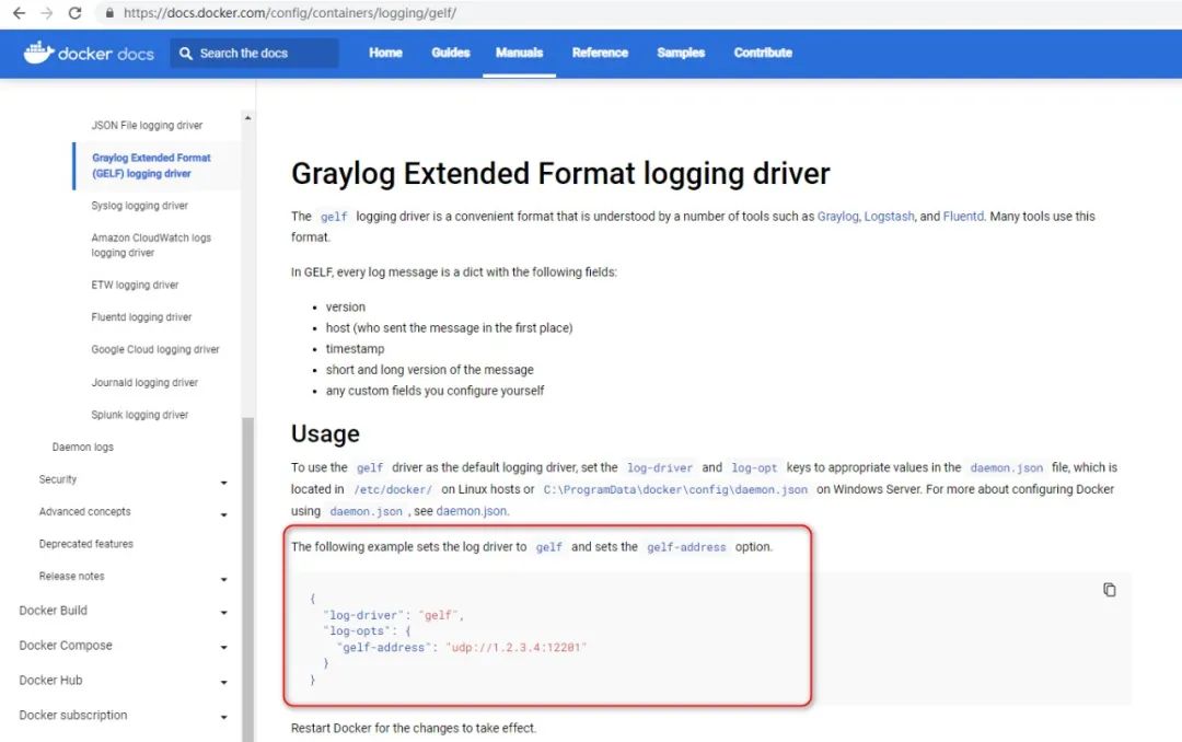 "gelf-address": "udp://{GraylogServerIP}:12201"
