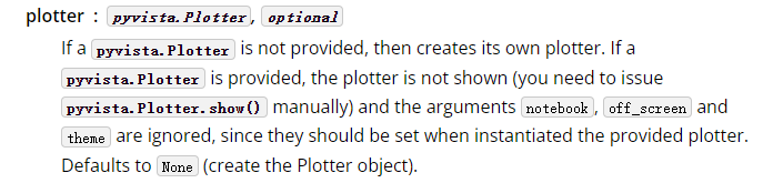再看文档中关于此参数的描述,似乎是只要传入一个pyvista.Plotter的对象即可将图形显示在该对象中,也就是说,只要将QtInteractor对象传给此参数即可实现目标,因为QtInteractor继承自Plotter类。