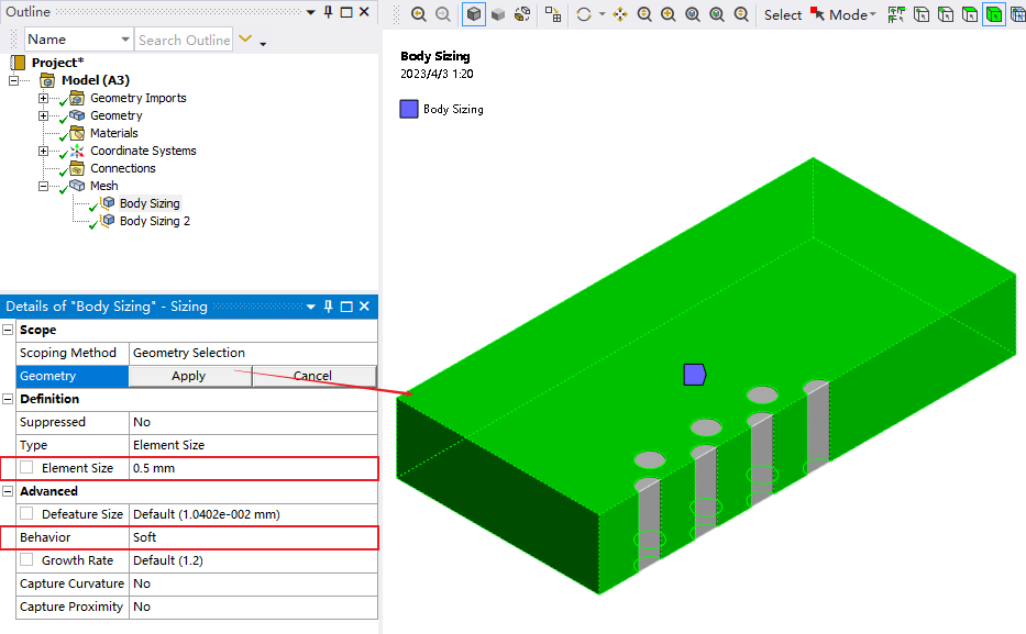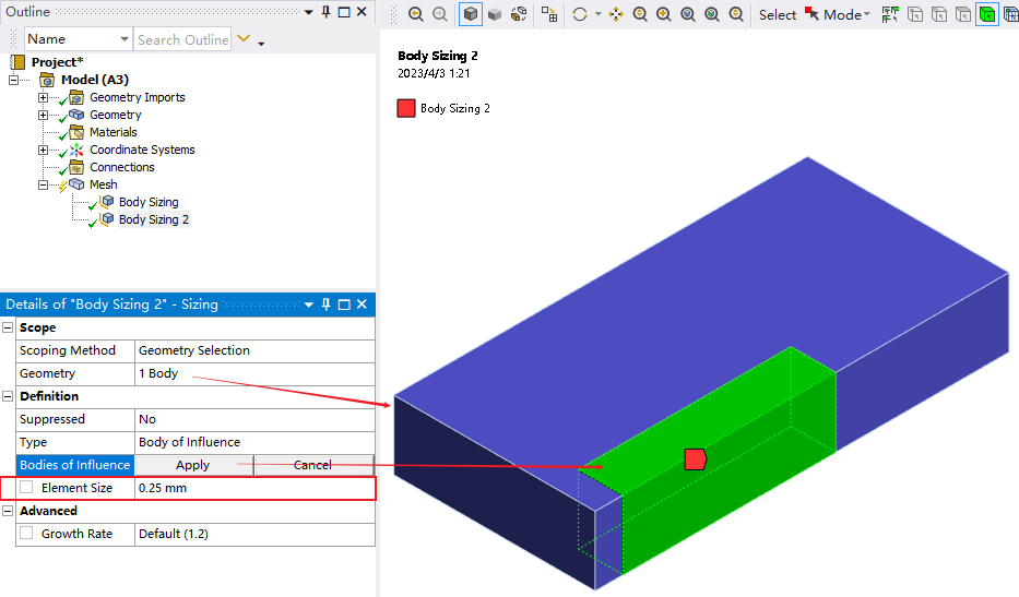 再指定BOI尺寸。如下图所示指定Type为Body of Influence,Element Size指定为0.25 mm。其中Geometry选择计算域几何,Bodies of Influence选择前面创建的BOI几何。