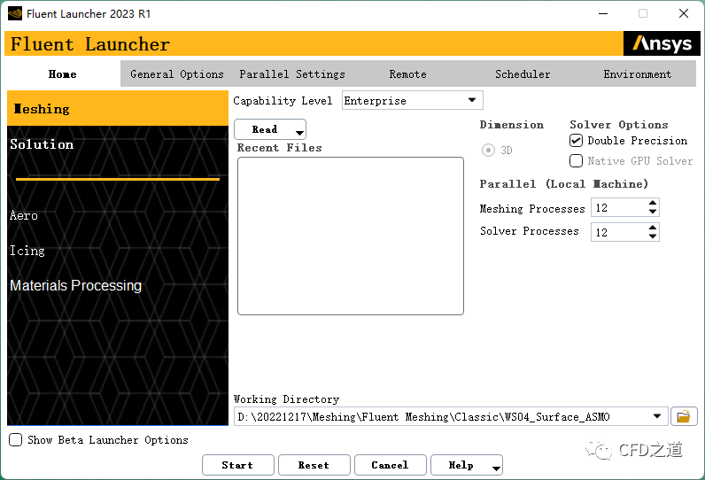 启动Fluent Launcher,选择选项Meshing ,同时设置Working Directory,如下图所示,点击Start按钮启动Fluent Meshing