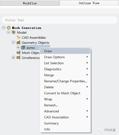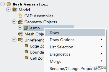 利用菜单File → Read → Mesh打开几何导入对话框,选择文件ASMO_NS-for-repair.msh.gz。(文件下载链接在文末) 右键选择模型树节点asmo,点击弹出菜单项Draw显示几何