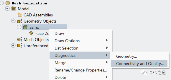 右键选择几何对象asmo,点击弹出菜单项Diagnostics → Connectivity and Quality… 打开几何检查对话框