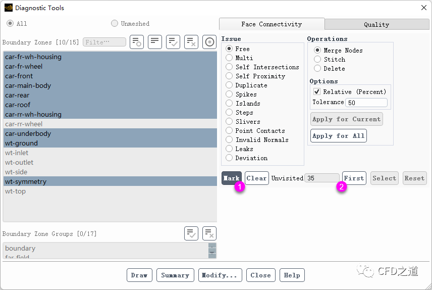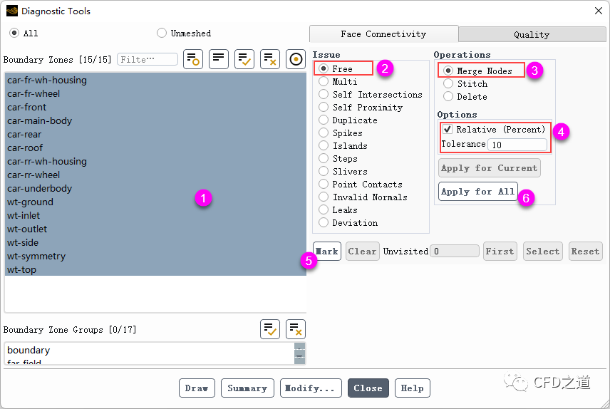 如下图所示顺序设置相对容差为10%进行自由节点查找,点击按钮Apply for All进行节点合并