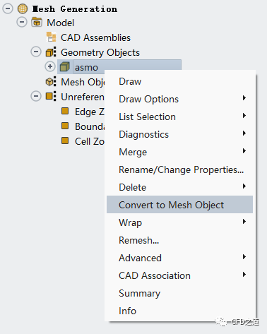 右键选择asmo,点击弹出菜单项Convert to Mesh Object将几何面转换为面网格