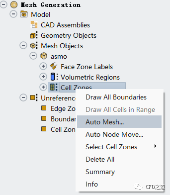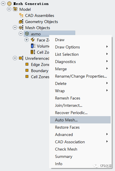 如下图所示右键选择Mesh Objects节点下的asmo子节点,点击Auto Mesh… 子菜单