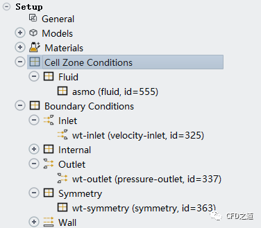相同方式指定出口为pressure-outlet,指定对称面为symmetry 切换进入Solution模式查看边界信息,如下图所示