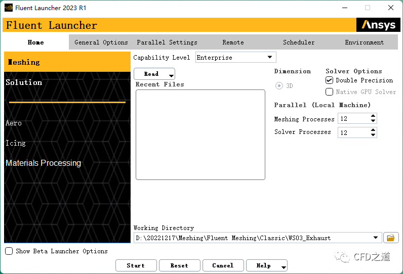 启动Fluent Launcher,选择使用Meshing,设置Working Directory