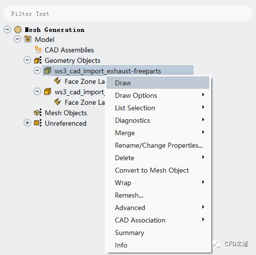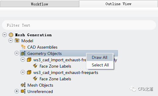 几何模型导入后,右键选择模型树节点Geometry Objects,选择弹出菜单项Draw All显示模型
