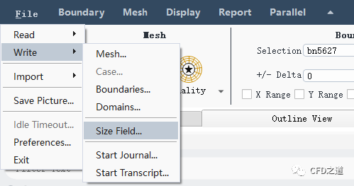 利用菜单File → Write → Size Field… 保存尺寸分布数据文件exhaust.sf
