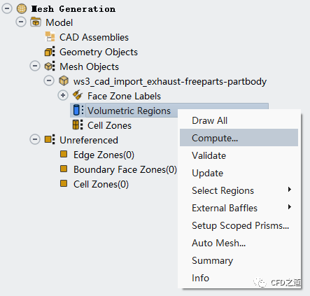 如下图所示,右键选择Volumetric Regions节点,点击弹出菜单项Compute… 抽取计算区域