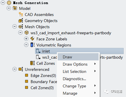 计算域抽取完毕后,右键选择模型树节点inlet,点击弹出菜单项Draw可以查看生成的流体域