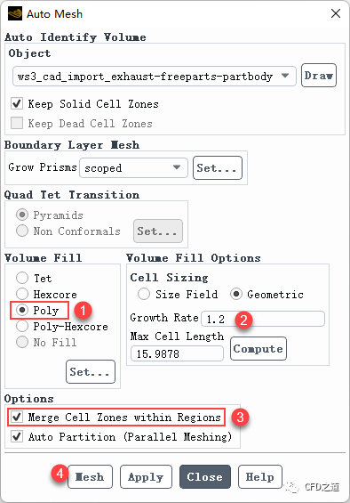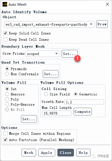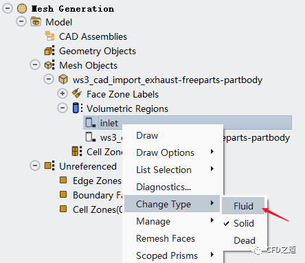 注:这里激活选项Keep Solid Cell Zones会在生成体网格时保留固体区域网格。若不需要固体域网格,可选择不激活此选项。