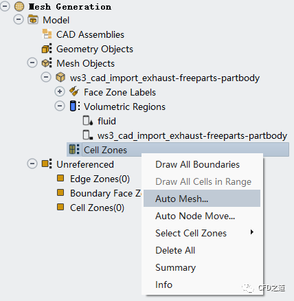 右键选择节点Cell Zones,点击弹出菜单项Auto Mesh… 打开参数设置对话框