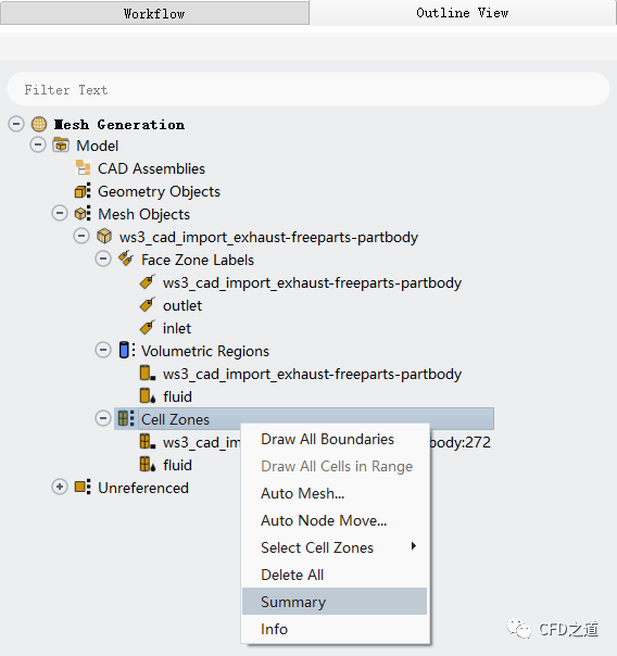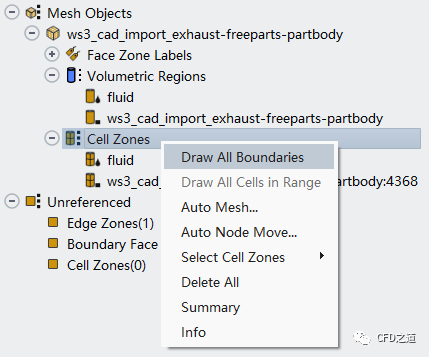 网格生成完毕后,右键选择节点Cell Zones,点击菜单项Draw All Boundaries