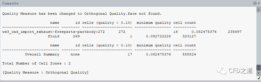TUI窗口中显示网格信息,如图所示,存在网格质量小于0.1的网格,需要对网格进行优化。