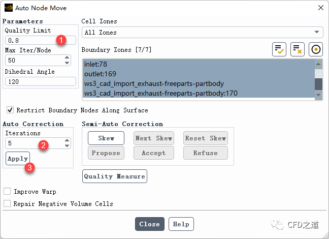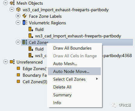 右键选择模型树节点Cell Zones,点击菜单项Auto Node Move… 打开设置对话框