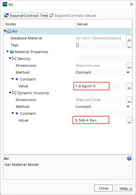 鼠标双击模型树节点Continua > Physics 1 > Models > Liquid > Air,弹出材料属性设置对话框,如下图所示 设置密度为1 kg/m3 设置动力粘度为5.56e-4 Pa-s 其他参数保持默认设置,点击Close按钮关闭对话框
