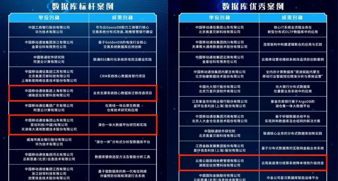 近日,由中国信息通信研究院、中国通信标准化协会大数据技术标准推进委员会(CCSA TC601)共同组织的第六届大数据“星河”案例评选结果公示,亚信科技及旗下亚信安慧支持完成的中国移动通信集团上海有限公司“业务支撑系统核心数据库迁移改造项目”、中国移动通信集团山东有限公司“湖仓一体大数据平台研究和实践”、云南公路联网收费有限公司“云南高速清分结算系统降本增效升级改造”三个项目分别入选数据库标杆案例、数据库优秀案例。