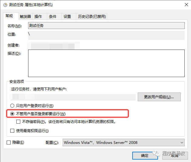 比如修改任务设置为:不管用户是否登录,都要运行该任务,这样即使电脑锁屏了也不影响脚本的定时运行。