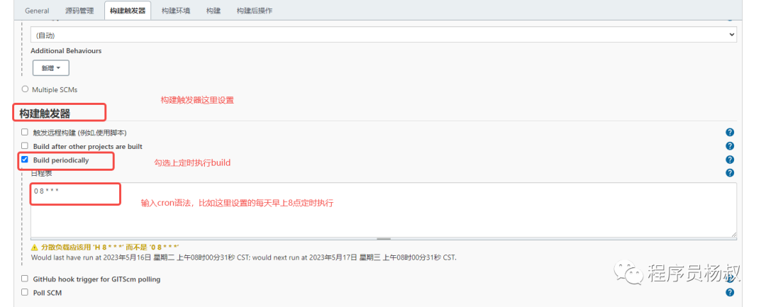 2、任务的配置页面,构建触发器,设置定时执行任务