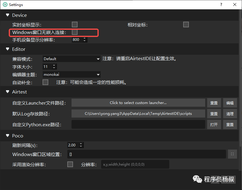 如果窗口比较大,不适合嵌入到Airtest中的,或者嵌入后显示异常的,可以在"选项"》"设置"中,勾选上"Windows窗口无嵌入连接"选项: