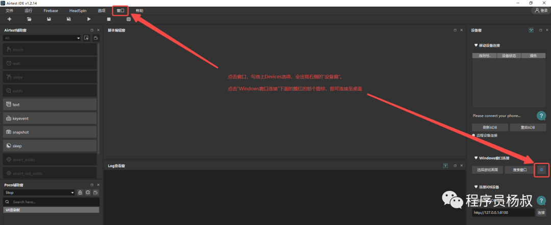 1、我们以自动化测试QQ音乐为例,先启动QQ音乐。然后回到Airtest IDE,新建点击“窗口”菜单,勾选上“Devices”, 点击“Windows窗口连接”的连接桌面图标,如下图: