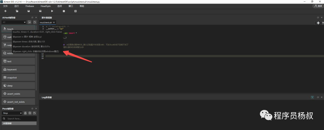 5、接下来就非常简单了,使用“Airtest”辅助窗下面的各个功能即可快速实现你要测试的场景。Airtest常用按钮说明: