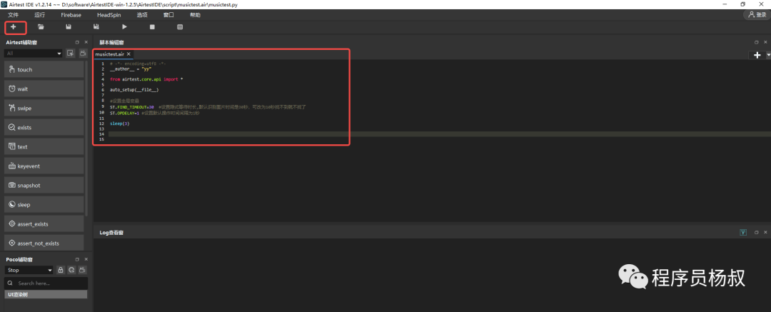 3、然后点击菜单栏的“+”号,新建“.air Airtest项目”,输入项目名称,IDE会自动导包初始化脚本,如下图: