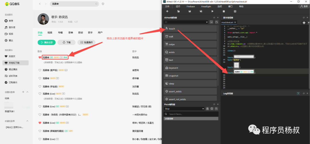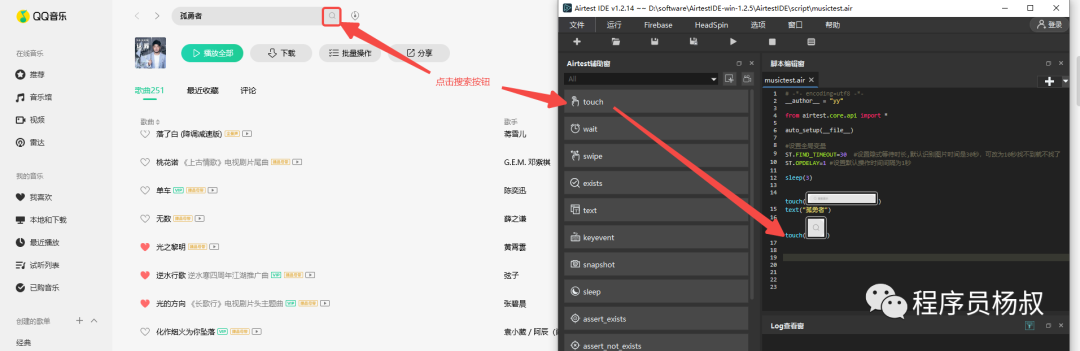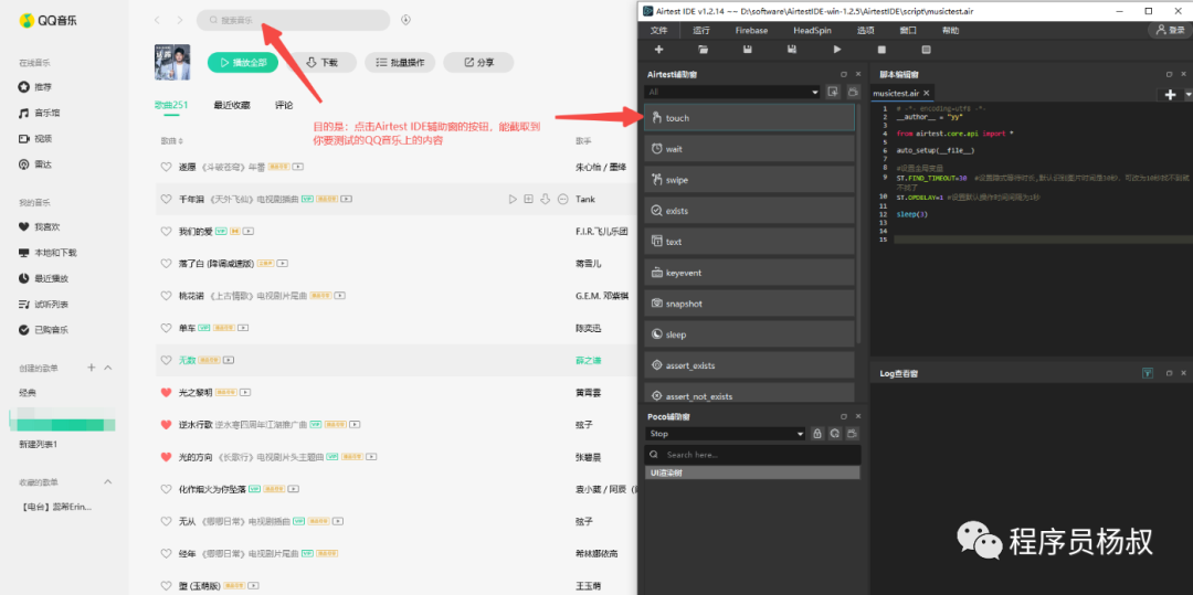 4、这个时候切换到QQ音乐窗口,然后缩小Airtest IDE窗口的大小,目的是让你可以使用“Airtest”辅助窗下面的各个功能按钮截取到QQ音乐上对应操作的图片: