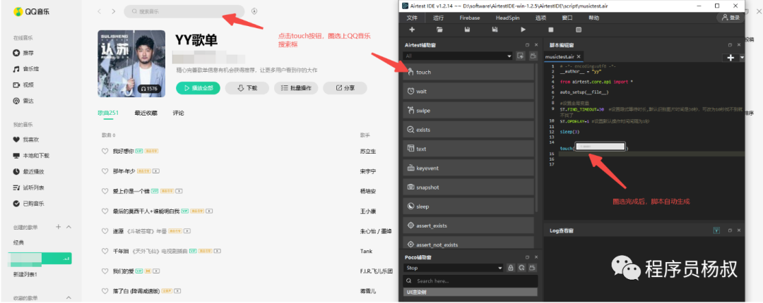 1、第一步是:点击搜索框。在Airtest IDE中点击touch按钮,框选上QQ音乐搜索框图片,选完图片后可以看到IDE中脚本已经生成: