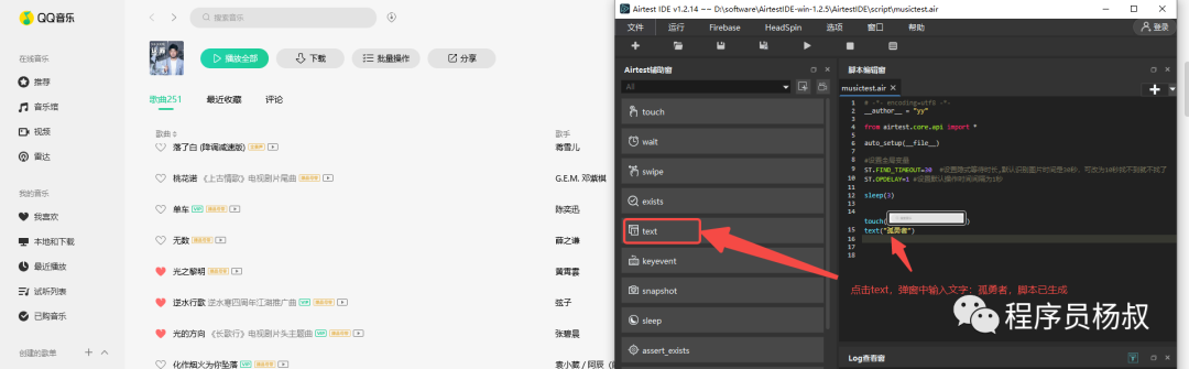 2、第二步:输入歌曲名字“孤勇者”并执行搜索操作。这一步直接点击Airtest IDE中“text”按钮,在弹窗中输入文字“孤勇者”,脚本就生成了: