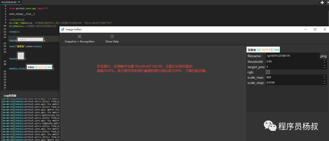 因此如果出现偶尔会点击到其他版本的“孤勇者”歌曲的情况,可以在Airtest IDE中双击该图片,设置该图片的识别匹配阈值为0.9,提高为90%匹配才算匹配上,就可以解决这个问题:
