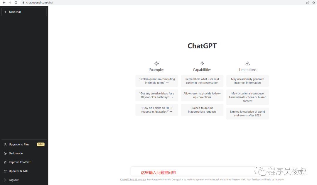 可以使用ChatGPT之后,作为一名IT从业者,第一件事就是测试它的编程能力到底如何,是否真的在未来会砸掉程序猿们的饭碗。ChatGPT的交互非常简单,在页面文本框上输入你的问题,点击发送,它就会给你相应的答复: